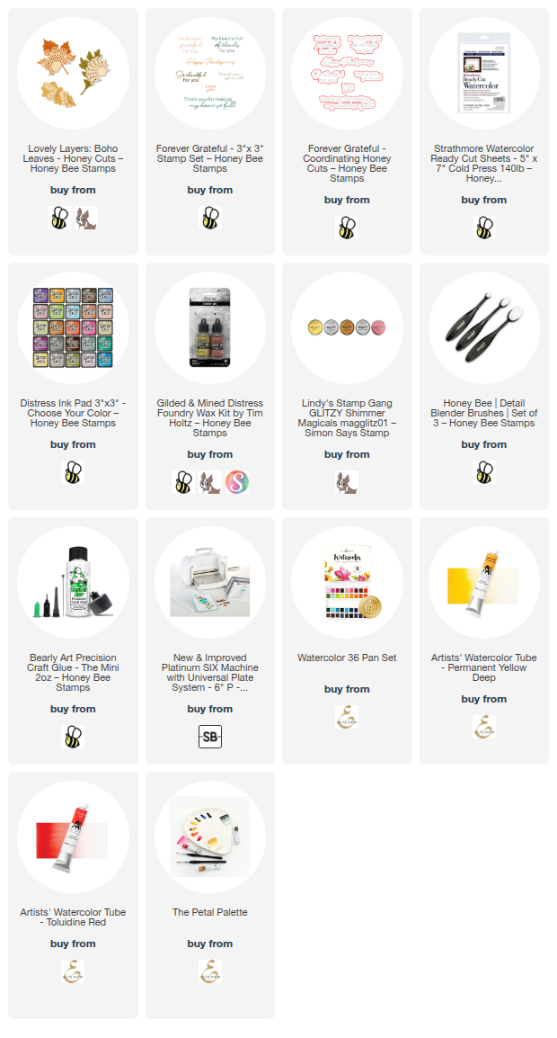 I've made a beautiful Thanksgiving card using the new Lovely Layers: Boho Leaves. First I made some lovely watery autumn colored panels. I used watercolor cardstock and painted on various green, golden yellow, and warm red watercolors from my stash. I have all of the available products in the list below.