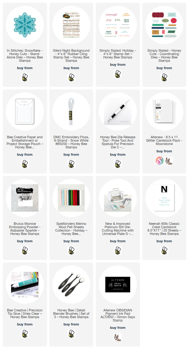 Happy Wednesday, crafty friends! Today I'm sharing my card featuring Honey Bee Stamps gorgeous In Stitches: Snowflake Honey Cuts with the equally beautiful Silent Night stamp! I created a sparkly stitched and embellished snowflake to add to my mixed media holiday card. Check out the details below!